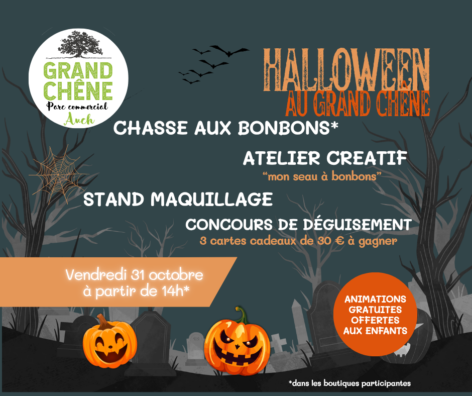 Petits sorciers, vampires et citrouilles, préparez-vous à trembler de plaisir ! Le Grand Chêne vous invite à fêter Halloween dans une ambiance monstrueusement fun ! 🕷️ AU PROGRAMME : 🍬 Chasse aux bonbons dans les boutiques participantes 💄Stand de maquillage pour transformer les petits monstres ! 🎨 Atelier créatif “Mon seau à bonbons” 🧙‍♀️ Concours de déguisement avec des cartes cadeaux à gagner ! 📍 Rendez-vous au Grand Chêne à partir de 14h 🎃 Animations gratuites et ouvertes à tous Prépare ton plus beau costume, viens t’amuser et repars les bras chargés de bonbons !