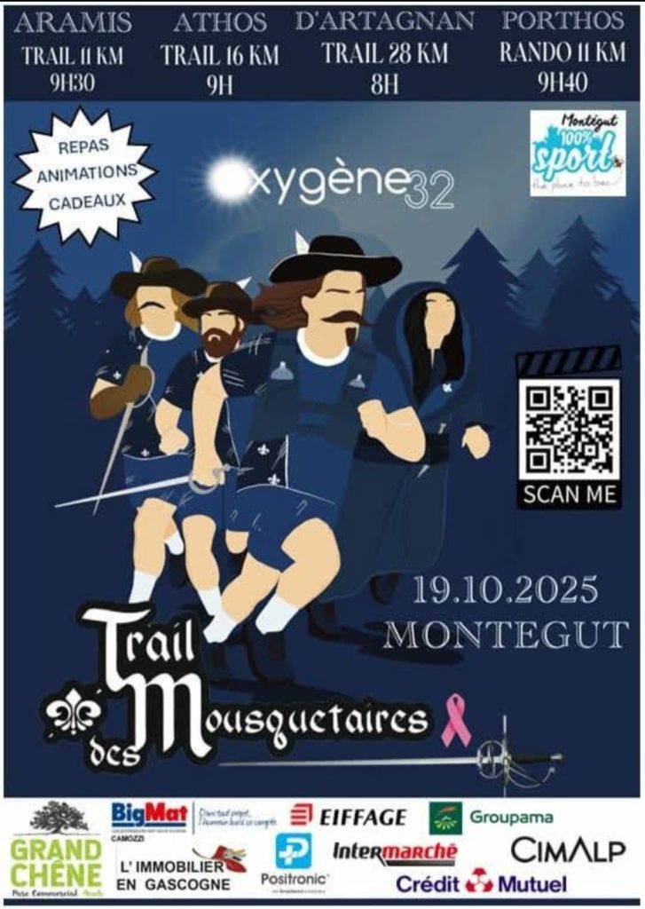 Le Trail des Mousquetaires revient à Montégut le 19 octobre 2025 et cette année encore, le Grand Chêne est partenaire !!🤝 🏃‍♂️ Choisis ton camp avec 3 formats : D’Artagnan – trail de 28 km pour les plus courageux Athos – trail de 16 km Aramis – trail de 11 km Porthos – rando de 11 km 🎁 Au programme : repas, animations, cadeaux et une ambiance 100 % gersoise comme on les aime ! Alors, que tu sois coureur, randonneur ou simple supporter, rendez-vous le 19 octobre à Montégut !